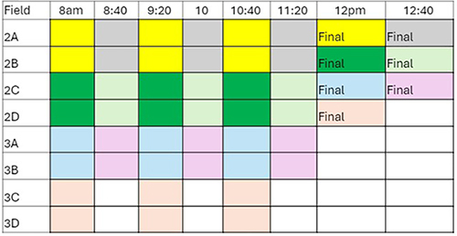 Team selections will be mixed and arranged by coaches of the ages within the brackets in order to prevent making lopsided and dominant teams. For example, we will group all the 2019B teams together to make a bracket of 4 teams consisting of 5-6 players to play 4v4 or 4 teams consisting of 4-5 players to play 3v3. It will all depend on how many players in total commit to playing all games on Saturday.